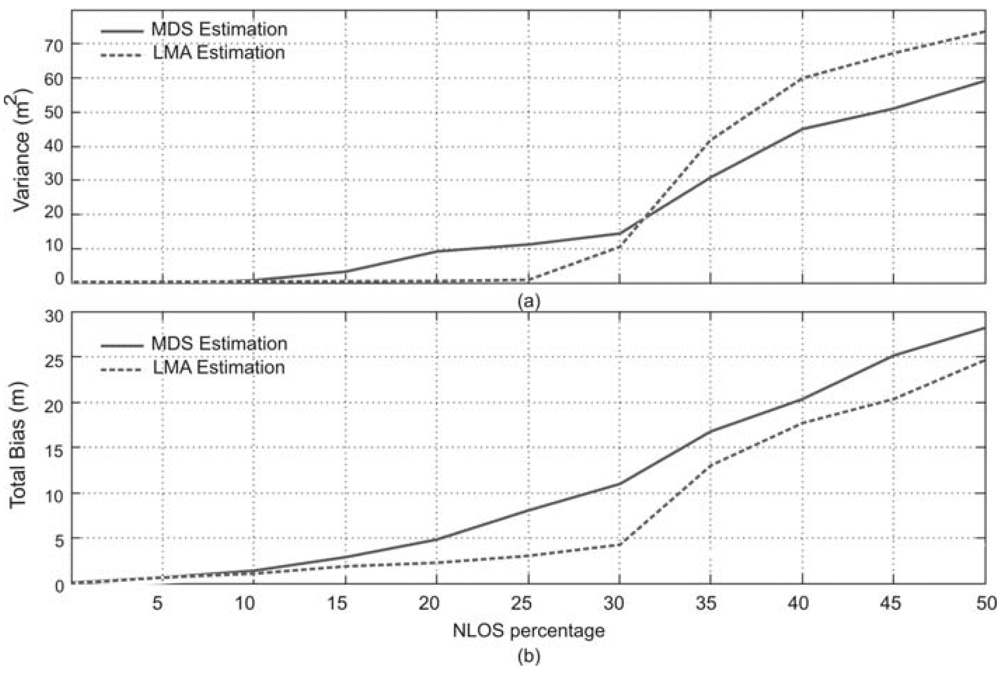 Errors in the position estimation considering NLOS effect between nodes N1 and N14 (see the node distribution in Figure 5). (a) Total variance in the coordinate estimation. (b) Total bias in the coordinate estimation.