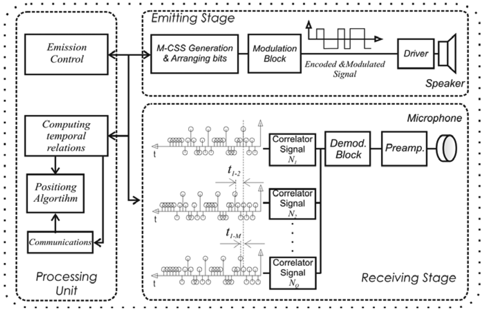 According to these signal processing techniques, the emitting stage implemented at the node hardware architecture is shown in Figure 2. This block is divided into the code generation stage for the M-CSS and the arranging bit stage. After that, the obtained encoding is transmitted by BPSK, which allows the emission to be adapted to the transducer bandwidth. Furthermore, a control emission block is implemented to fire the acoustic signal emission, managed by the processing unit. On the receiving module, the demodulation of the signal captured by the microphone is computed after adjusting and digitalizing it. Then, the signal is processed to determine the arrival time of every encoded acoustic emission. For that, a set of correlators has been implemented, according to the algorithms developed in [16] and [17], to detect the emissions carried out by, at most,Q nodes. With the results obtained at the correlator outputs, a peak detector algorithm has been applied in order to determine the arrival instant. Although Q nodes can be simultaneously detected in each common perception area, the Q codes can be replicated in nodes located in other different areas. Practical values of Q can reach, for example, 64 nodes depending on the time required between successive position computations.