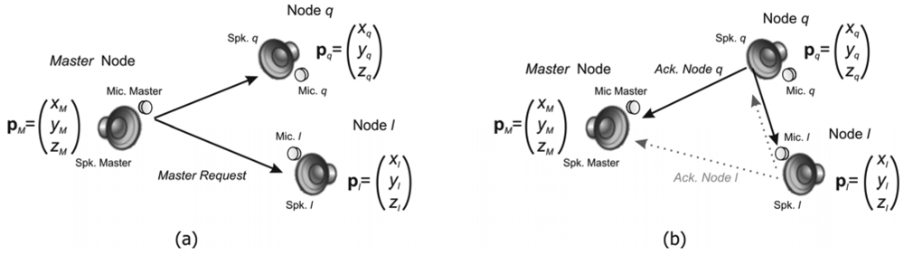 It is assumed that node q = 1 is the Master and has the following coordinates (xM, yM, zM), described by a vector pM. On the other hand, the positions of two slave nodes q and l are given by vectors pq and pl. At a given instant, the Master node emits its encoded acoustic signal (see Figure 3a) starting the RTOF measurement. This emission, called Master Request, is detected by every slave node with their microphones Mic. q and Mic. l at different instants according to their distribution in the environment.