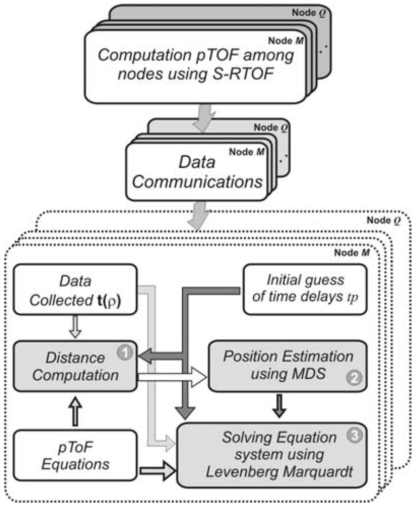 The diagram of the algorithms used to compute the relative positions among nodes is shown in Figure 4. After applying the S-RTOF ranging method and assuming that the nodes have communicated the pTOFs computed by each one of them, the position can be obtained. The MDS algorithm provides a first approximation using the distances calculated with the pTOFs. Then, the results can be improved by using the Levenberg-Marquardt Algorithm (LMA), considering the MDS positions and the characterization of the time delays, performed by auto-calibration [19] or by off-line characterization, as initial point for LMA.