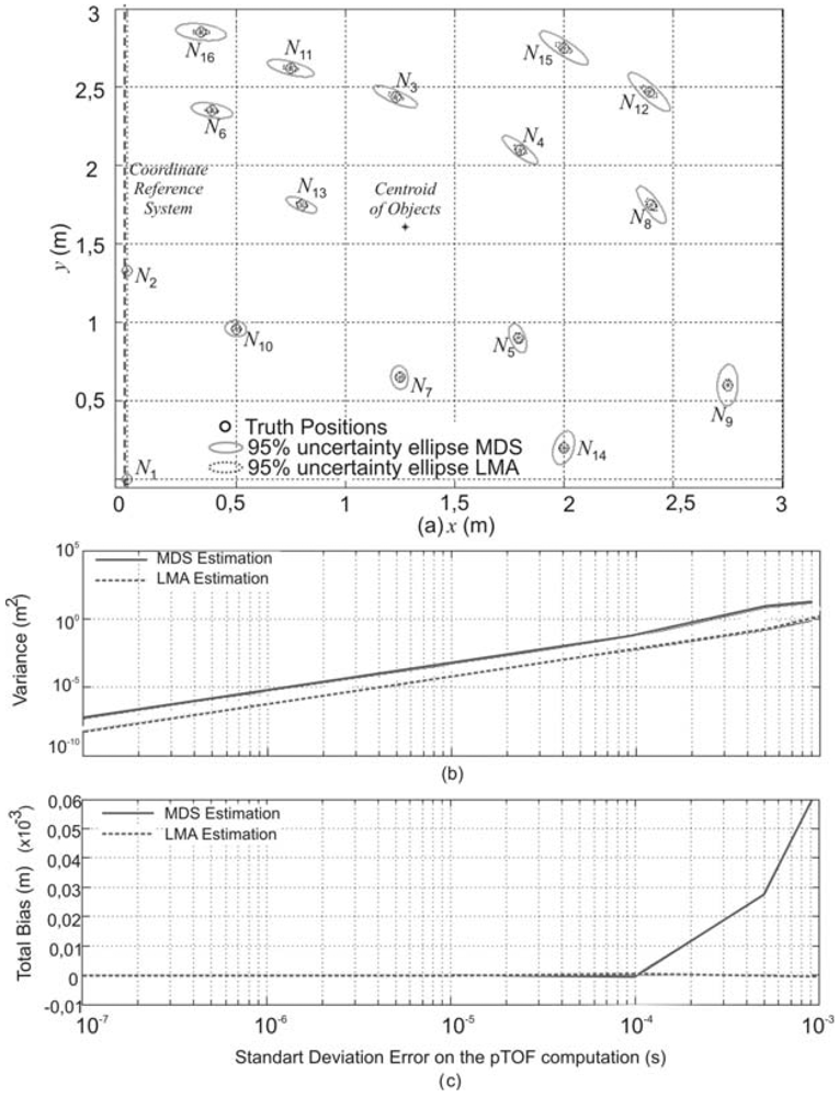 Figure 5a shows the 95% uncertainty ellipses (2σ) obtained around the estimated coordinate when the pTOFs have a Gaussian noise with a standard deviation σ = 100μs. Using LMA for optimization it is possible to achieve a closer solution for the coordinate estimation, as shown with dotted lines in Figure 5a. Also, a characterization of the position algorithms through the total bias and total variance in the coordinate estimation has been carried out. In this case, different standard deviations in the measurement errors have been considered. As shown in Figure 5b, the results obtained by LMA have a smaller variance in the coordinate estimation for all the nodes. On the other hand, both estimators are unbiased, even in those cases where the considered standard deviation is σ = 100μs (see Figure 5c), what implies an error in the distance measurements around 3 cm.