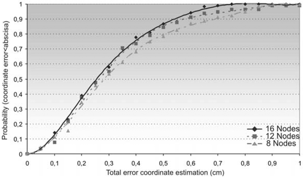 If the positioning algorithms for N4 are computed changing the number of nodes in the topology described in Figure 6, i.e., considering 8, 12 and 16 nodes in every test, it can be observed that if the number of nodes is increased, the variance in the position estimation decreases. In order to verify this feature, the cumulative distribution function (CDF) of the positioning error has been obtained for the coordinate estimation of common node N4. The CDF is plotted in Figure 6 for different numbers of nodes, considering an error σ = 10μs in the pTOF measurements. In this case, if more node information is added, a higher increment of the cumulative effect is obtained, which means that a better precision can be achieved.