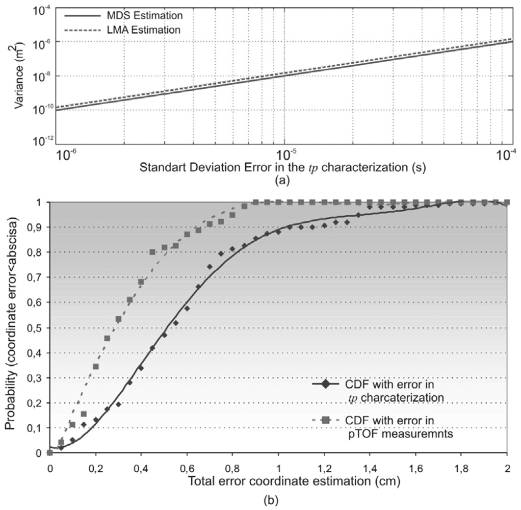 In this case, it is observed that the MDS allows a higher precision than the LMA (see Figure 7a). On the other hand, in Figure 7b, the CDF for the position estimation of node N4 is depicted with a continuous line, only for errors in the determination of tp. Comparing it to the CDF obtained only for errors in the pTOF computation (dotted line in Figure 7b), it is observed that LMA is less sensitive to errors in the pTOF measurements than to errors in the tp characterization. This implies that the used positioning algorithm is less sensitive to errors in the node coordinates than to errors in the time delays.