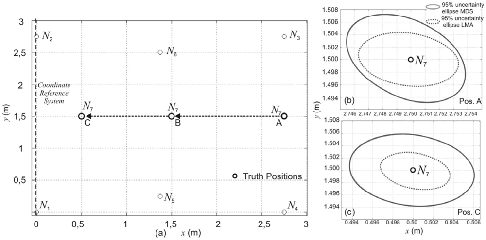 In the previous analysis it is assumed that the node topology is fixed. In the topology described in Figure 8 node N7 moves from point A, to B and C. At every position, the algorithms have been run one thousand times. The pTOFs have a Gaussian noise with a standard deviation σ = 10μs.Figure 8b and Figure 8c show a good accuracy in the position estimation of the node N7. In this case, the orientation of the 95% uncertainty ellipse varies but the precision in the coordinate estimation does not depend on the node position referred to the reference system.