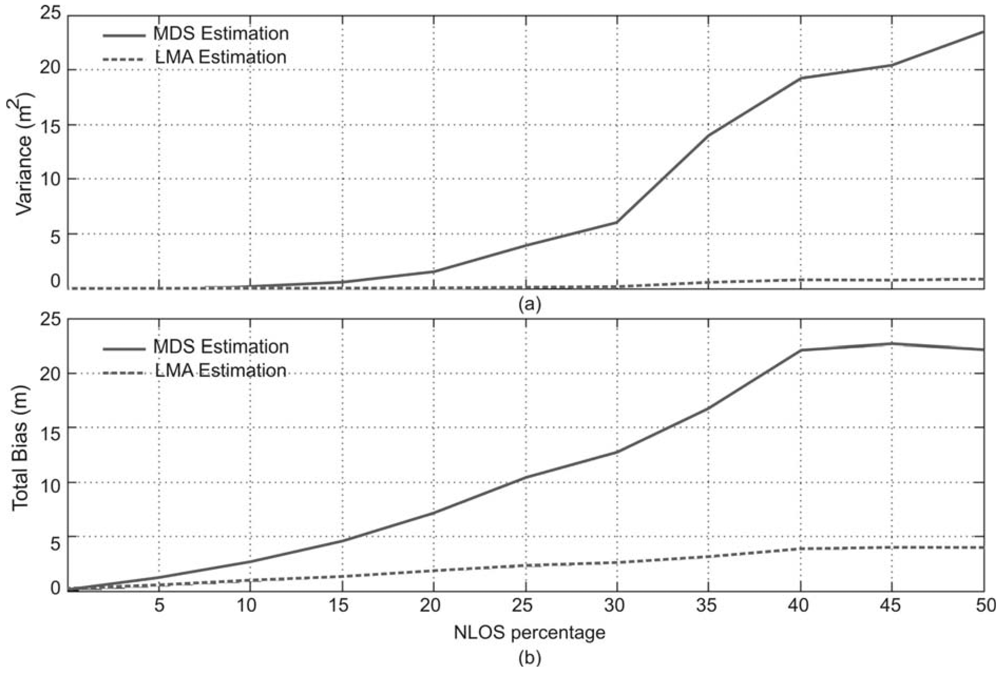 In order to verify the performance of the proposed algorithms with NLOS effects, the topology of Figure 5 has been tested. In the first test performed, the distance measurements between nodes N1 and N14 have a large observation error, whereas other nodes have clear LOS path. In practice, this situation can happen when the LOS path between the considered nodes is blocked by walls or other signal-scattering object. The NLOS has been modelled as a positive bias error with an uniformly random distribution, where the maximum value is a percentage of the real pTOF measured in the interval [0%, 50%]. The total bias and total variance in the position estimation have been obtained for the different NLOS error considered as is depicted in Figure 9. In this case, the LMA estimation of node positions allows to obtain a suitable precision and a low bias in the global node position estimation, when the NLOS provides errors up to 35% over the real pTOF between the nodes N3 and N6. Nevertheless, when stronger NLOS effects appear between the considered nodes, the global node position estimation has a reduced performance with both algorithms.