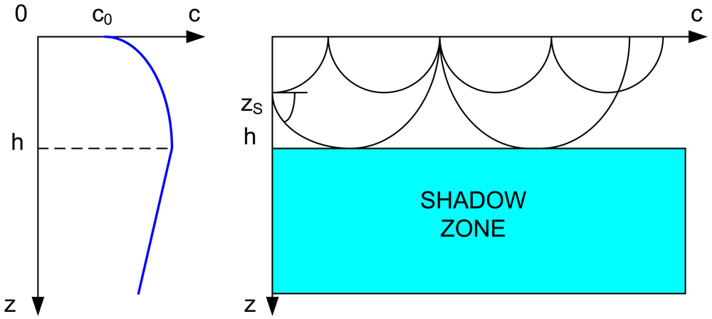 Shadow zone formation beneath the mixed layer when sound velocity monotically decreases with depth.