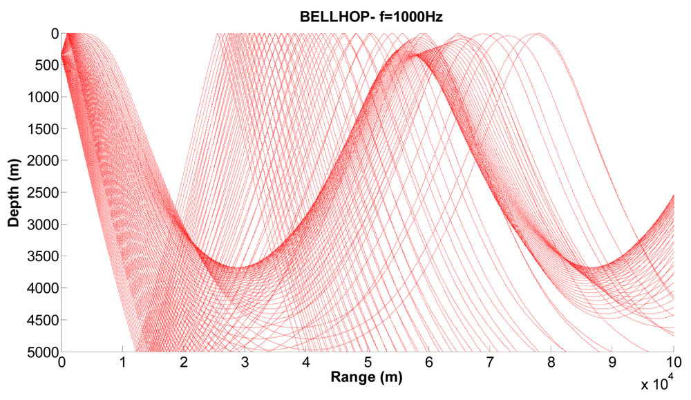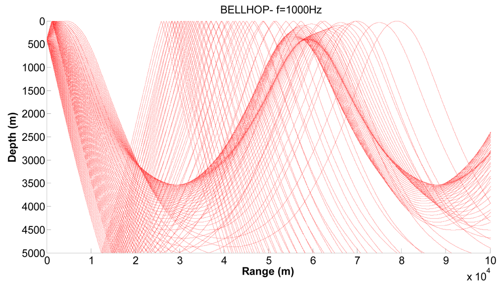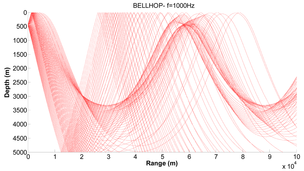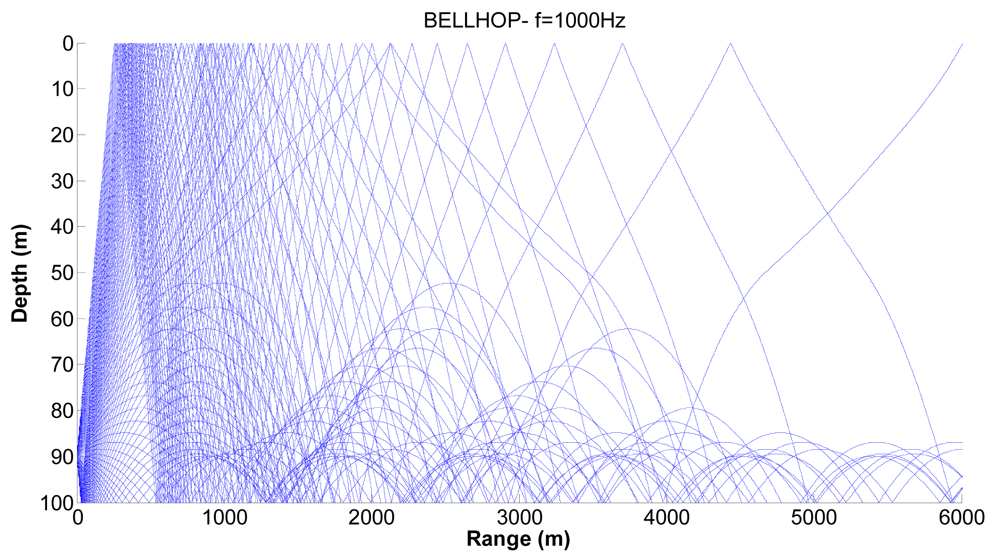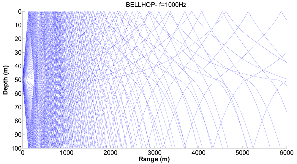 Corresponding ray trace for a source depth of 50 m.
