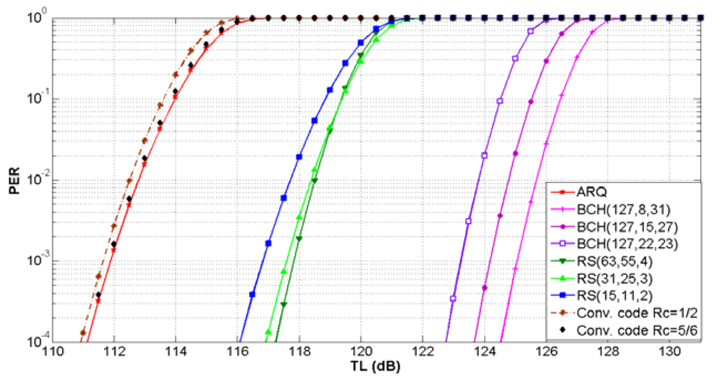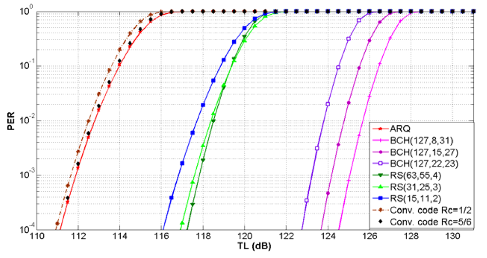 The FEC convolutional code with Rc = 1/2 has the lowest TLTh value. This is the worst case, because the maximum transmission loss is restricted to lower values. Therefore, with this error control scheme for a target PER of 10−2 the maximum TLTh of 112.5 dB for shallow water and 129 dB for deep water have been selected. More details about the performance of error control schemes in UWSNs can be found in [20].