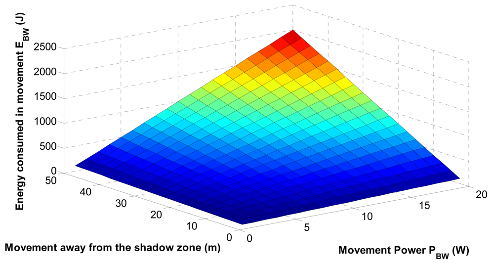 Now we analyze the energy consumed by the electronically controlled engine to move the sensors affected by the shadow zone to the optimal position. Figure 15 shows the energy consumption in the sensor movement. We observe that the energy consumed is increased with the movement power and the covered distance to reach the optimal location. Since the sensor relocation can be costly in terms of energy consumption, it is limited by the threshold ETh; this paramenter is estimated analyzing the battery capacity, the required average displacement as well as PBw.