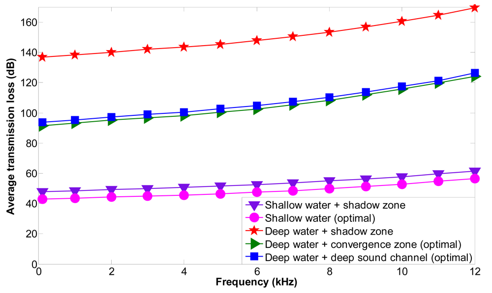 Figure 16 shows the average transmission loss as a function of frequency for shallow and deep water under different propagation phenomena. We have computed the transmission loss for the acoustic link li i+1 (between si and si+1) affected by the shadow zone (shallow water + shadow zone or deep water + shadow zone). si is uncoupled and the optimal location for node si→2 is found outside the shadow zone using our mathematical model; the transmission loss for the acoustic link li→2 i+1 (between si→2 and si+1) (shallow water (optimal), deep water + convergence zone (optimal) or deep water + deep sound channel (optimal) has also been computed. The average transmission loss is increased when the frequency is increased and is higher for deep water + shadow zone than for shallow water + shadow zone. It is also higher for deep than shallow water. The transmission loss values are higher than the transmission loss threshold for deep water+shadow zone, which means that the transmitted signal will not be properly received. The average transmission loss values are reduced significantly when the optimal locations are computed and the communication between sensor nodes is again restablished outside the shadow zone. The maximum transmission loss improvement is of 4.9 dB for shallow water, of 45.1 dB for deep water + convergence zone and of 42.9 dB for deep water + deep sound channel. Therefore, we can conclude that using our mathematical model deep water + convergence zone shows the best improvement in the diminishment of the transmission loss.