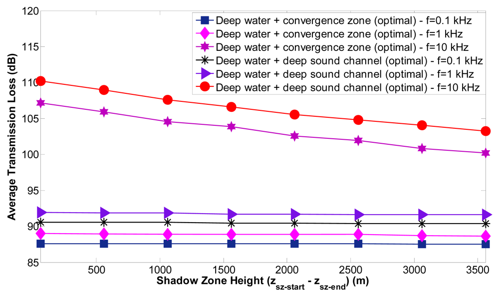 The transmission loss values are especially decreased with the shadow zone height for the frequency of 10 KHz; the reason is that the depth of the optimal location is increased when the shadow zone height is increased (zsz−end is higher) and the transmission loss decreases when the depth is increased. Otherwise, the transmission loss values for 0.1 KHz and 1 KHz are only very slightly decreased by the shadow zone height and are only significantly increased with the frequency.