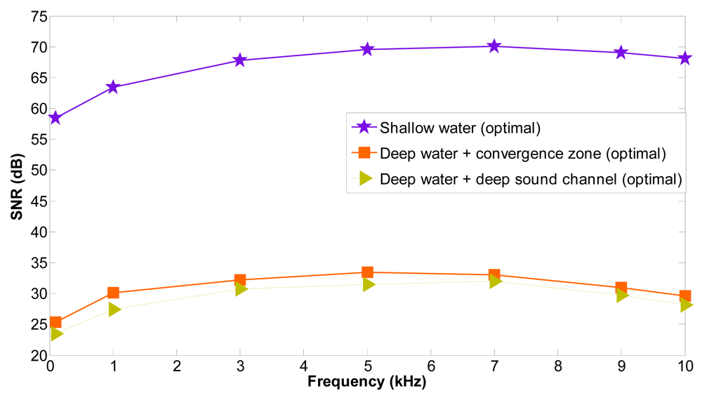 The average SNR values in the presence of shadow zones are negative, which indicates that the signal is below the noise level and transmission loss, and it can't be properly recovered. The average SNR values are increased significantly when the optimal locations are computed and the communication between underwater sensors is again reestablished outside the shadow zone. Furthermore, the improved SNR values are maintained for all frequencies. With shallow water the SNR values are better because in shallow water the transmission loss values are lower. The SNR values are higher with deep water + convergence zone than with deep water + deep sound channel. Nevertheless, in all cases the SNR loss values are increased outside the shadow zones.