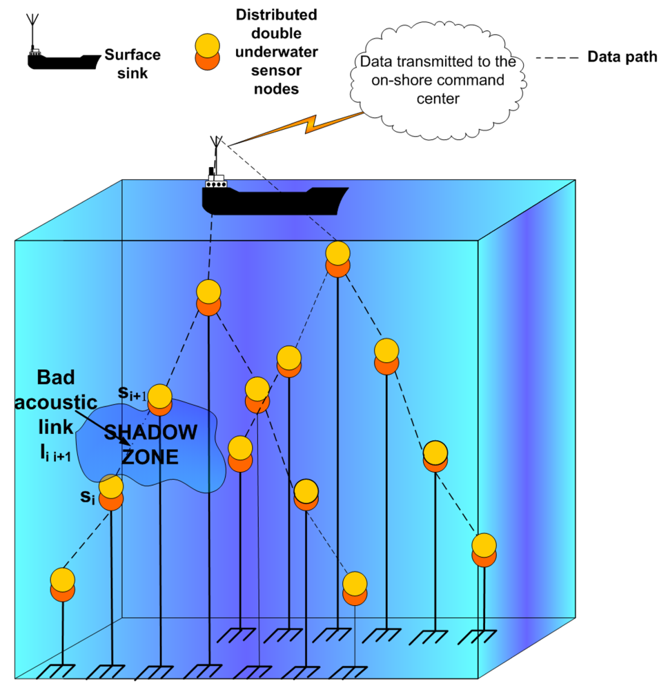 We consider the example of the tree-like topology shown in Figure 2, where sensor nodes sense data and sent it upwards to the surface station using multi-hop routing. We assume that the distributed sensor nodes are double units. The cost of implementing double sensors will be limited because software modems will be coupled with generic microphones and speakers that are built-in to create off-the-shelf sensor modules [14-16]. In this way, the need for specialized communication hardware will be eliminated and the system cost will be reduced. The cost per node ($) for hardware modems that use especialized hardware is around 104 $, whereas the cost of software modems that use generic hardware (off-the-shelf configuration) is around 102 $; this cost decrease facilitates the deployment of sensor nodes to form underwater acoustic sensor networks. The double sensor nodes operate as a single sensor when the underwater communication is reliable. This fact changes in the presence of shadow zones.