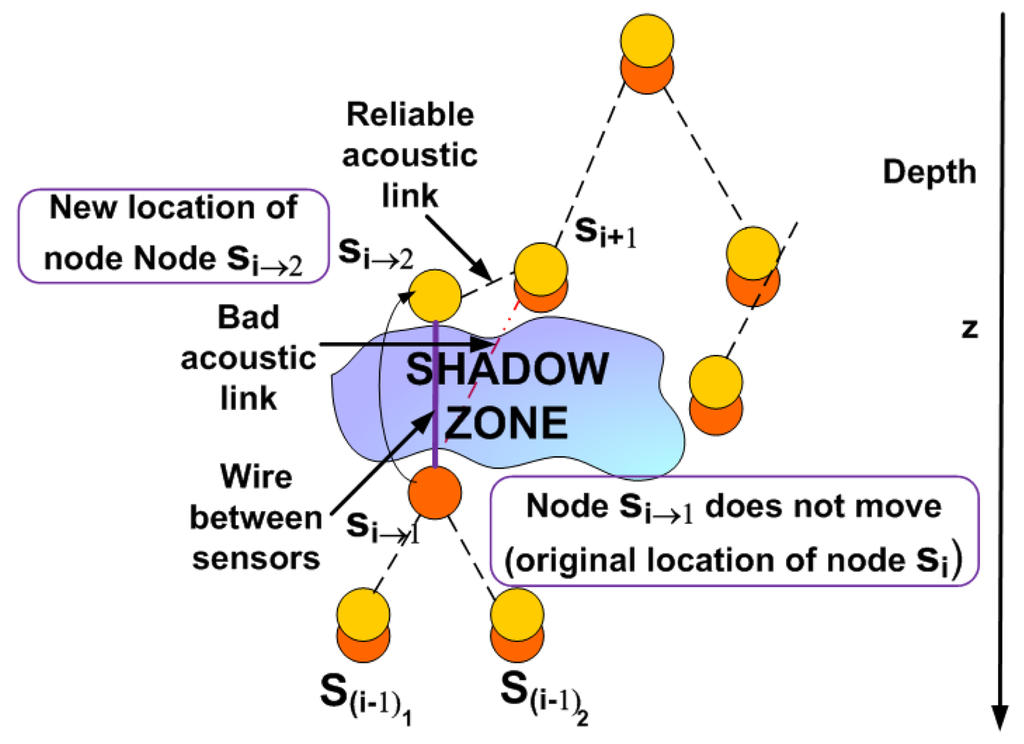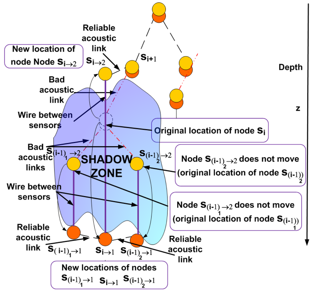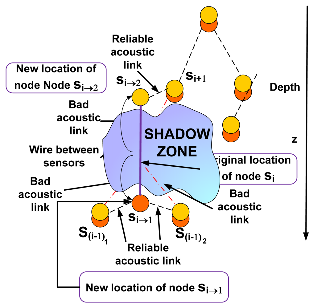 If the node s(i-x+1)k→1 has already moved to a new location outside of the shadow zone and node s(i-x)k→1does not know its depth z(i-x+1)k→1, node s(i-x)k→1 can move to (x(i-x)k, y(i-x)k, zsz-end + ε) and once there establish connection with node s(i-x+1)k→1 to find out the depth and afterwards compute its optimal location using this information.