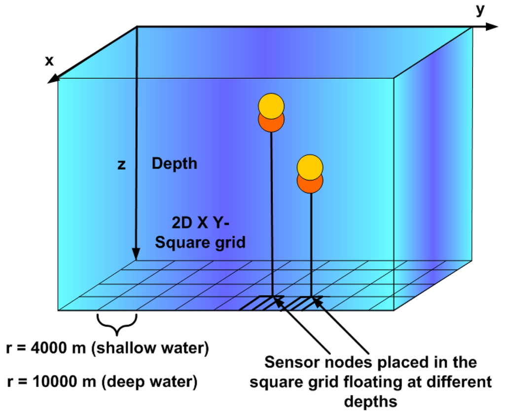 The whole seabed is divided into a 2D square grid of equal sizes r = 4,000m for shallow water and r = 10,000 m for deep water as shown in Figure 6. The sensor nodes are located in a square grid floating at different depths. 25 sensor nodes are deployed in a 3D volume of 16,000 × 16,000 × 100 m3 for shallow water and of 40,000 × 40,000 × 5,000 m3 for deep water. In shallow water, sensor nodes are located following a hierarchical structure at the depth levels of 25, 50, 75 and 90 m. In deep water, we study the communication between sensor nodes located following a hierarchical structure at the depth levels of 300, 350, 400 and 450 m.