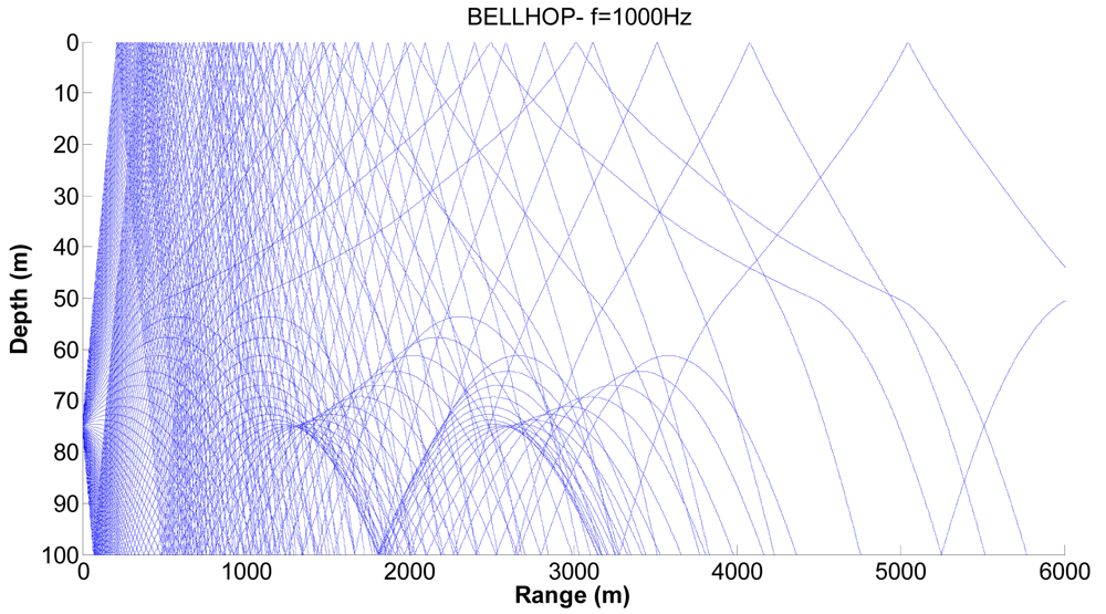 Corresponding ray trace for a source depth of 75 m.