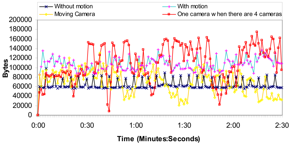 Figure 12 shows the number of bytes per second for the 1st, 2nd, 3rd and 4th situations. We can observe that the worst case is when the video acquired has motion. On the other hand, we think that the moving camera situation is rampant because of the bandwidth used to control the camera. There is no case with more than 140,000 bytes per second (1.12 Mbps). Then, we have divided the number of bytes per second obtained by the number of cameras. The average number of bytes is around 109.2 KBytes (873 Kbits), while the average number of bytes per second when there is just one camera is 63.6 KBytes (509 Kbits). So the system allows 34 cameras in each access point.