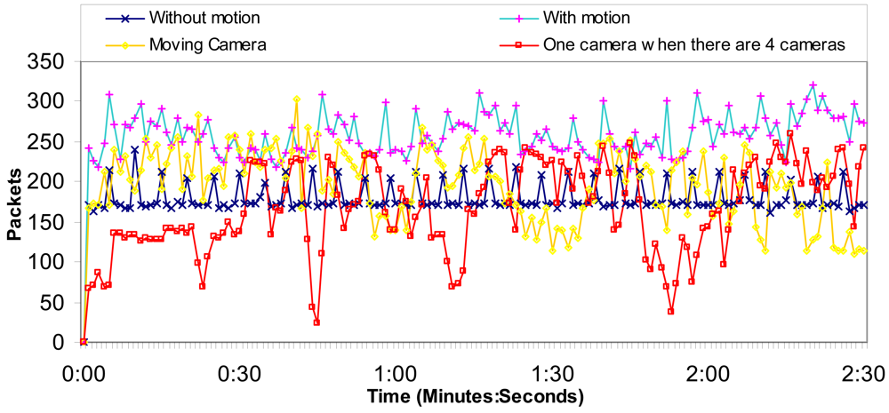 Figure 13 shows the number of packets per second for the 1st, 2nd, 3rd and 4th situations. We can observe that the worst case is when the video acquired has motion. The moving camera sends messages in a rampant manner without any rule. The average number of packets per second, due to one camera, when there are four cameras is around 167 packets/s, while the average number of packets per second when there is just one camera is 180 packets/s. So the system allows many cameras.