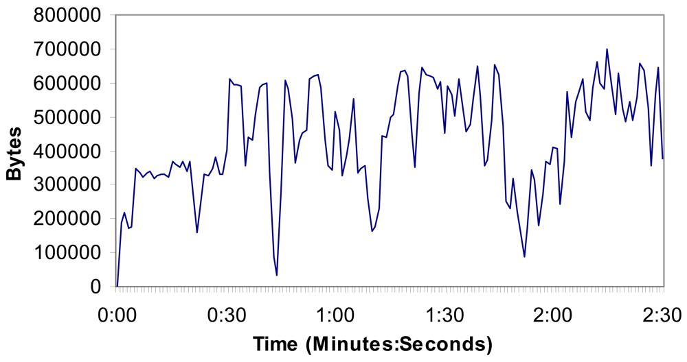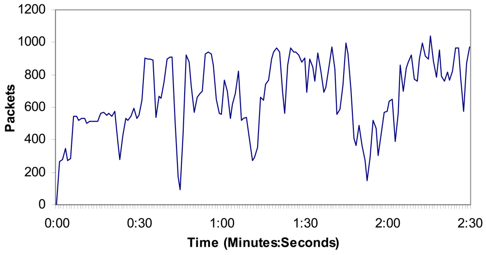 We have measured a wireless IP camera placed in the rural area transmitting MPEG-4 codec compressed video over http protocol in order to test the number of bytes per second and the number of messages per second in the network. It lets us know the camera bandwidth consumption. The video resolution was 320 × 240 at 25 fps. The wireless IP camera also transmitted audio at 24 Kbps from the camera to the web page. We have measured, for 2 minutes and 30 seconds, the following situations:
