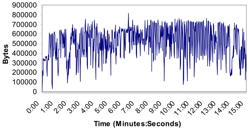 Figure 16 shows the number of bytes per second. There are not more than 800,000 bytes in the wireless network and the mean value was 514,013 bytes. The measurements show that the implemented system can support video streaming from all four Wireless IP cameras without problems because there is not so much bandwidth consumed and the system is stable.