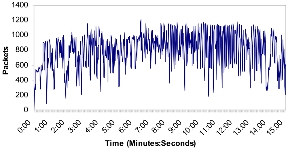 Figure 17 shows the number of packets per second in this case. No packet peak reaches 1,200 packets in the wireless network and the mean value was 798 packets. There are not too many messages through the medium at the same time. As the number of packets sent through the network is proportional to the number of cameras in the wireless network, 34 cameras will send around 40,800 packets per second through the network in this case. On the other hand, we could add one more access point. Taking into account the area covered by the cameras (few cameras are needed to cover large distances) and the number of sensors per each access point (see the research study made in figure 4), the designed system is scalable with the only limitation of the bandwidth of the backbone technology used to join the access points.