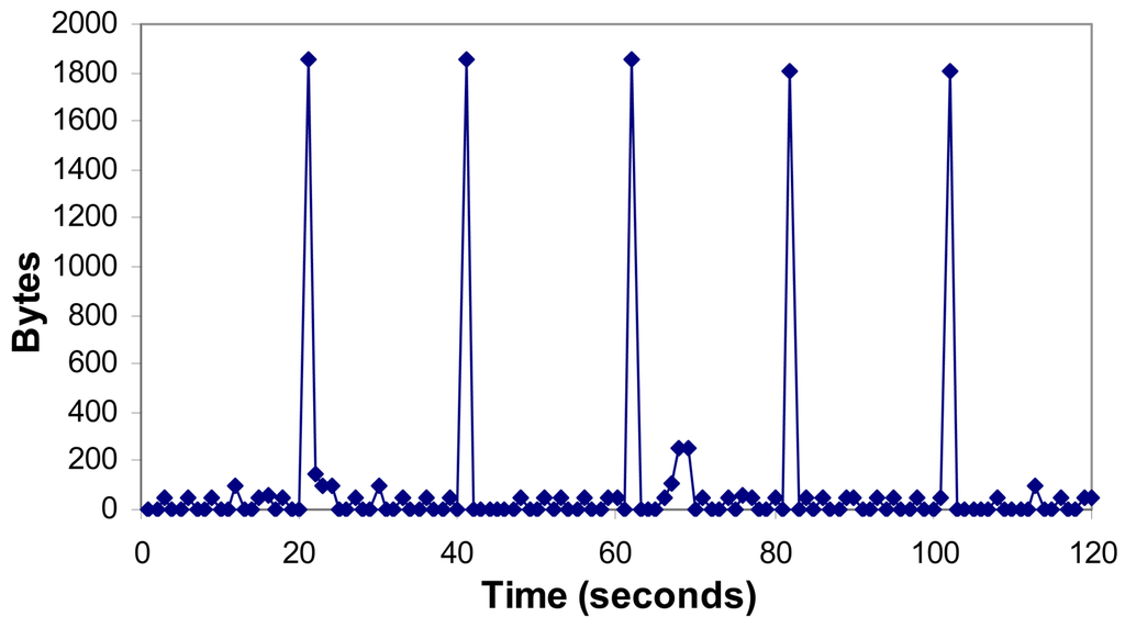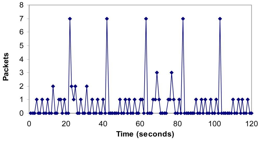 Figure 19 shows the number of packets per second when there is an alarm. It shows that the maximum number of packets per second in the network is seven. We have shown that an alarm makes peaks of 3 packets as is shown between the 60th and the 70th second. There is an average value of 0.68 packets per second.