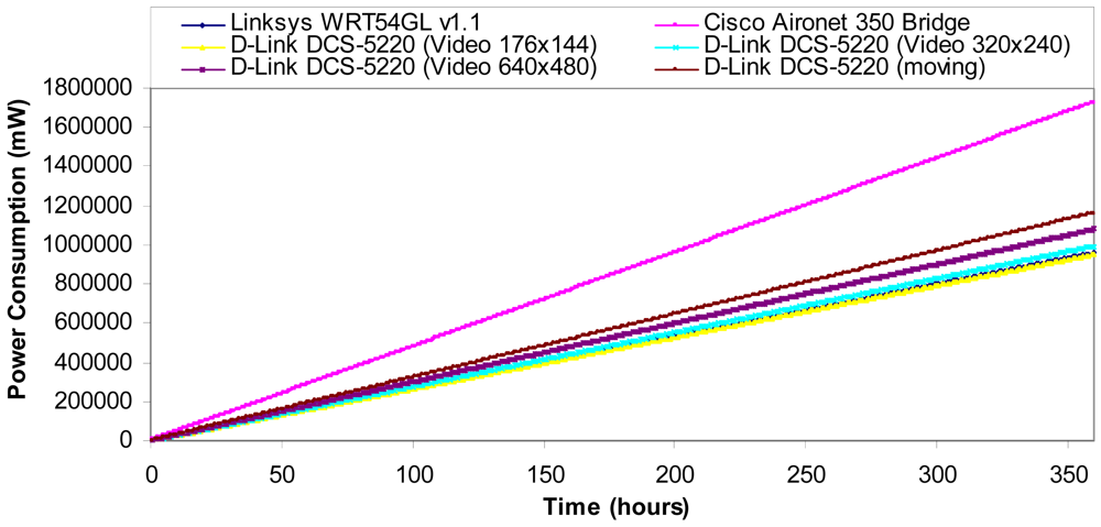 Table 3 shows the power consumption for each device depending on its state. The device that consumes more power is the Cisco Aironet 350 Bridge and the one that consumes less power (but if it is not moving) is the Wireless IP Camera (D-Link DCS-5220). On the other hand, we can observe that the wireless IP Camera does not have “Idle mode”, so it will be sending images all the time. So it has higher power consumption.
