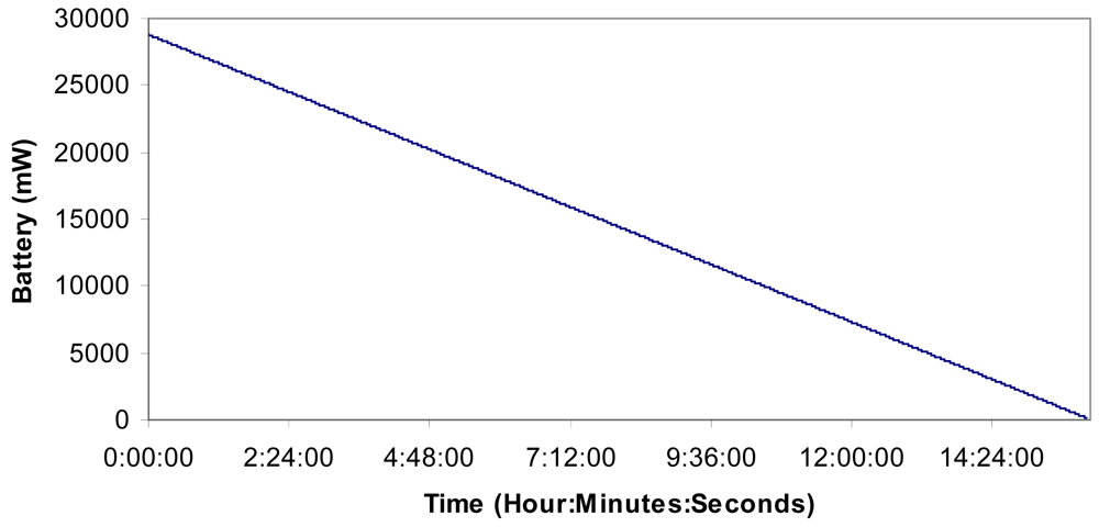 Taking into account the measurements taken in section 8.3, the multisensors send an average value of 1,175 bits per packet. Now, we can estimate the power consumption because of the packets transmitted and received by all multisensors over time. The multisensor is supplied by a 12 V 24 Ah battery with a solar panel, but we switch off the solar panel (no sun shinning for many days) in order to know its lifetime. We have considered the circuit energy consumption, the data processing energy consumption, the energy, when it is reading and writing in the memory, and the energy consumed by the physical sensor as being close to zero because the energy consumed is very little compared with that consumed by the nodes due to all the packets sent and received. Figure 21 shows the energy consumption of a multisensor in the worst case (always transmitting or receiving without any time being in the idle mode). The multisensor will be able to be in this hard mode for more than 16 hours. Then, the battery has to be charged using the solar panel