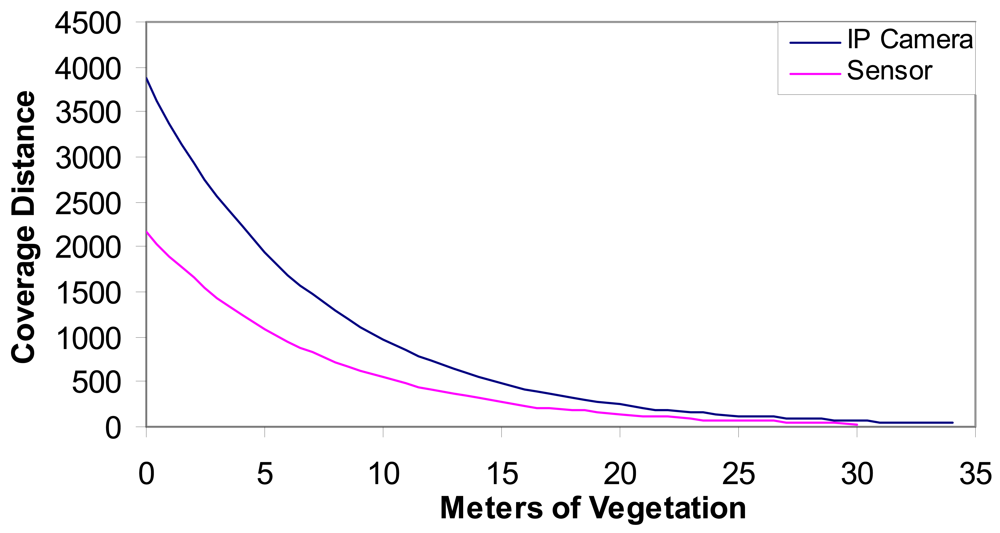Where m is the number of meters of vegetation and Grx is the gain of the antenna of the device (the IP camera or the sensor). Figure 3 shows the coverage distance (the distance between access points and the wireless IP cameras and the sensors) as a function of the meters of vegetation through the light of sight path. We can see that around 34 meters of vegetation is allowed in the case of an IP camera and approximately 30 meters of vegetation for the sensors.