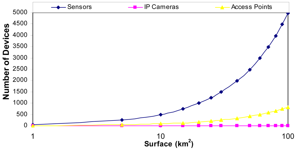 Taking into account the measurements provided in Figure 3, if we have 24 meters of vegetation, there could be a distance of 80 meters approximately (a tree every 10 meters with a diameter 3 meters) from the sensor to the access point. Figure 4 shows the number of devices that can be placed in our system as a function to the area that is wanted to be covered. We have supposed the worst case: an access point every 6 sensors in order to maximize the area covered.