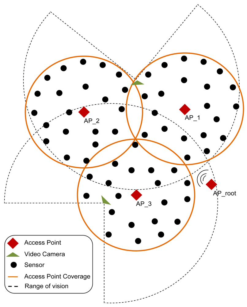 Figure 5 shows an example of the topology. There are more sensors than access points and fewer cameras than the other devices (the cameras are the most expensive devices). There is an access point configured as a root and three access points configured as a non-root access points.