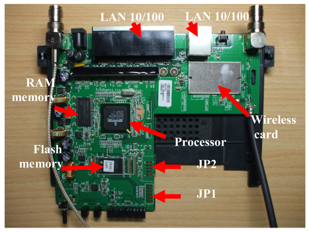 Our proposal is based on the use of the Linksys WRT54GL router, from Cisco Systems inc., as the core controller [28]. It is an embedded system that has a wireless IEEE 802.11 b/g interface, a FastEthernet interface in its board, so it meets our pre-requisites. In addition, Linksys WRT54GL offers internally General Purpose Input/Output (GPIO), UART (JP2) and ETAJ (JP1) ports. Some extensions can be made to the router by using these ports. Figure 6 shows the embedded board and its hardware distribution.