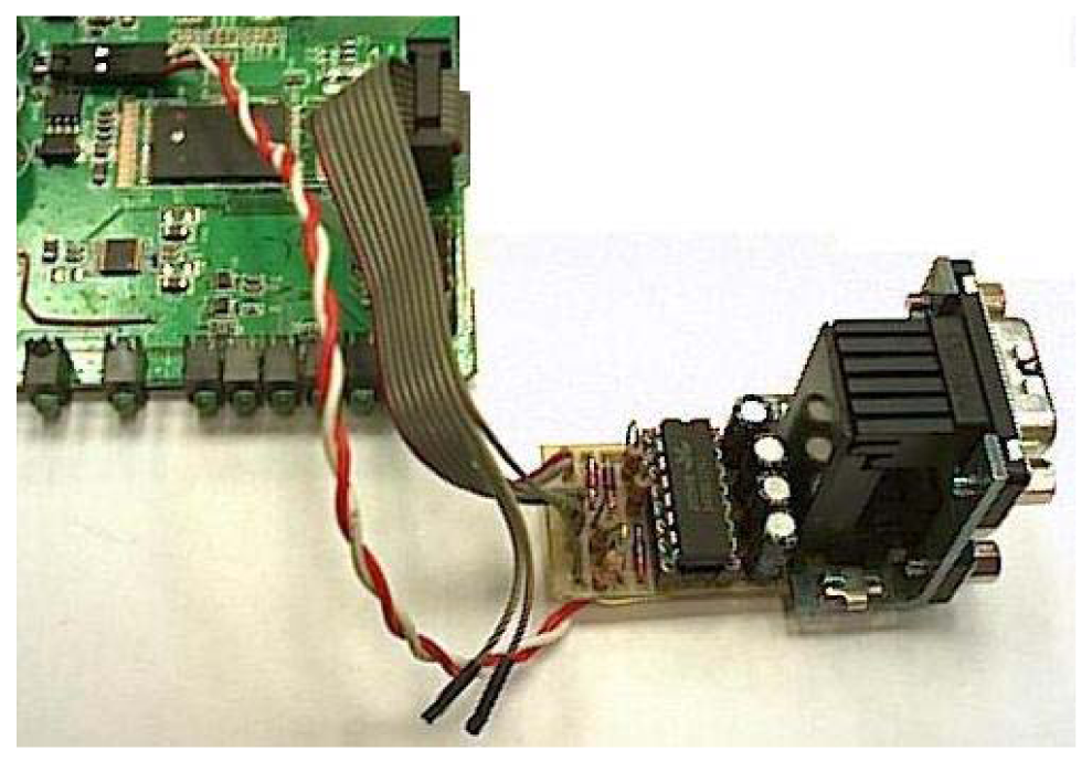 In order to connect two sensors directly to the board, we made an extension using the GPIO of the Linksys WRT54GL router. It provided us two serial ports through the JP2 port. Figure 7 shows serial ports connected on board by welding pins on JP2. Then we added two DB9 Female DCE ports because we wanted flexibility in order to change the type of sensor connected to our device. To be able to connect a device with RS232 connection, it is needed a logical levels adapter based on MAX233 Integrated Circuit. The Linksys WRT54GL router has TTL family logical levels so we had to adapt them to the RS232 family logical levels. Figure 7 shows the integrated circuit used to provide two serial ports. A RS232 line converter is needed to go from +3.3V to +5V.