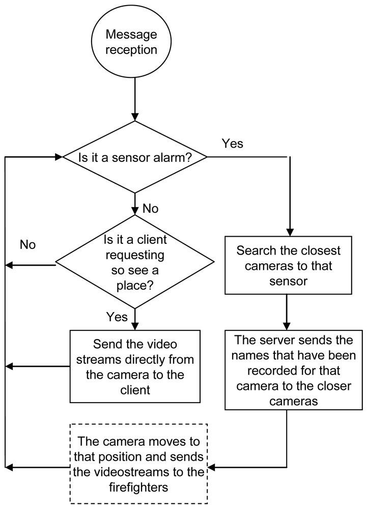 The mode of operation is as follows. All cameras have been recorded with the coordinates where they have to move and focus for each sensor placed in their visual coverage. The server has a database with the position of the sensors and the name of the cameras placed in the rural area close to every sensor (they are stored by name: sensor_1, sensor_2, etc.). When a sensor detects a fire, it sends an alarm directly to the server. This alarm message has the name of the sensor. When the server receives this message, it searches in its database the closest wireless cameras to that sensor and sends them a message with the name of the sensor that has sent the alarm and the position they must move to in order to watch the image of that zone. Finally, the cameras move their objective to the coordinates of the sensor. The camera will show what is happening in that zone and the fire fighter can corroborate if there is a fire or not.