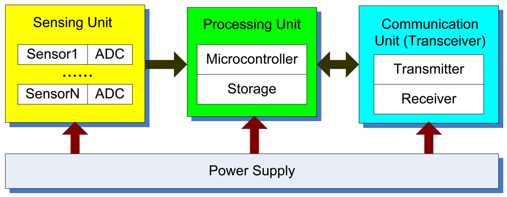 As shown in Figure 1, there are typically four main components in a sensor node [1], i.e., a sensing unit, a processing unit, a communication unit, and power supply. The sensing unit may be composed of one or more sensors and Analog-to-Digital Converters (ADCs). Sensors are hardware devices that measure some physical data of the monitored system's state such as temperature, humidity, pressure, or speed. The analog signals produced by the sensors are digitized by ADCs and sent to the processing unit for further processing. Within the processing unit, there is a microcontroller associated with a small storage unit including on-chip memory and flash memory. The processing unit is responsible for performing tasks, processing data, and controlling the functionality of other components of the sensor node. A wireless sensor connects with other nodes via the communication unit, where a transceiver encompasses the functionality of both transmitter and receiver. The wireless transmission media may be radio frequency, optical (laser), or infrared. At present, the main type of power supply for wireless sensor node are sbatteries, either rechargeable or non-rechargeable. Energy is consumed for sensing, data processing, and communication. For small wireless sensor nodes (with limited computing capacity), data communication will expend the majority of energy, while sensing and data processing are much less energy-consuming.