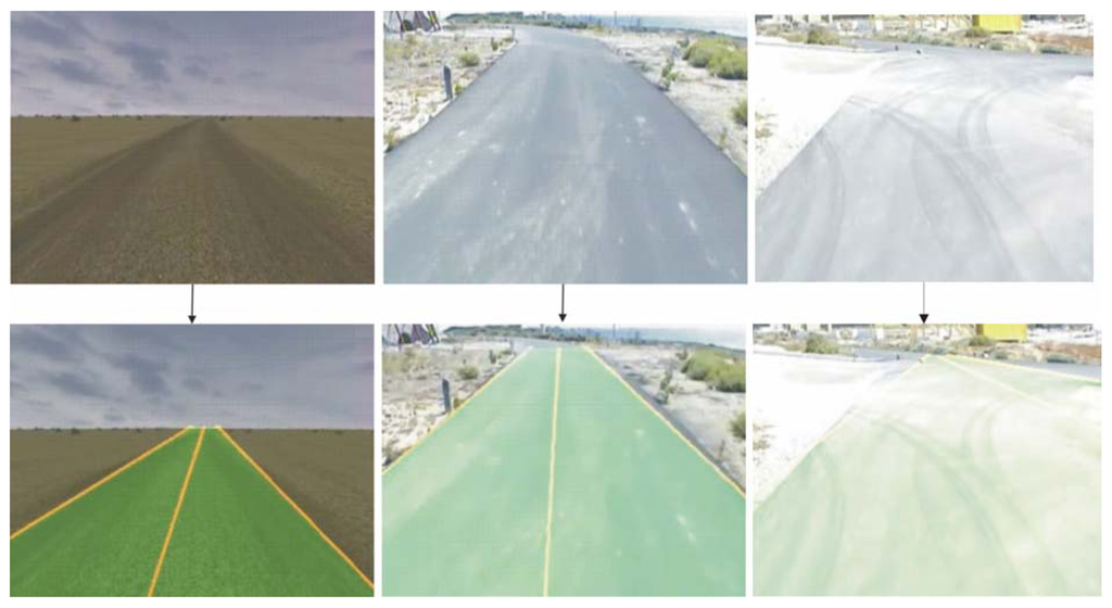 - Crisman, J.; Thorpe, C. UNSCARF: A Color Vision System for the Detection of Unstructured Roads. Proceedings of the IEEE Internetional Conference on Robotics and Automation, Sacramento, CA, USA; 1991; pp. 2496–2501. [Google Scholar]