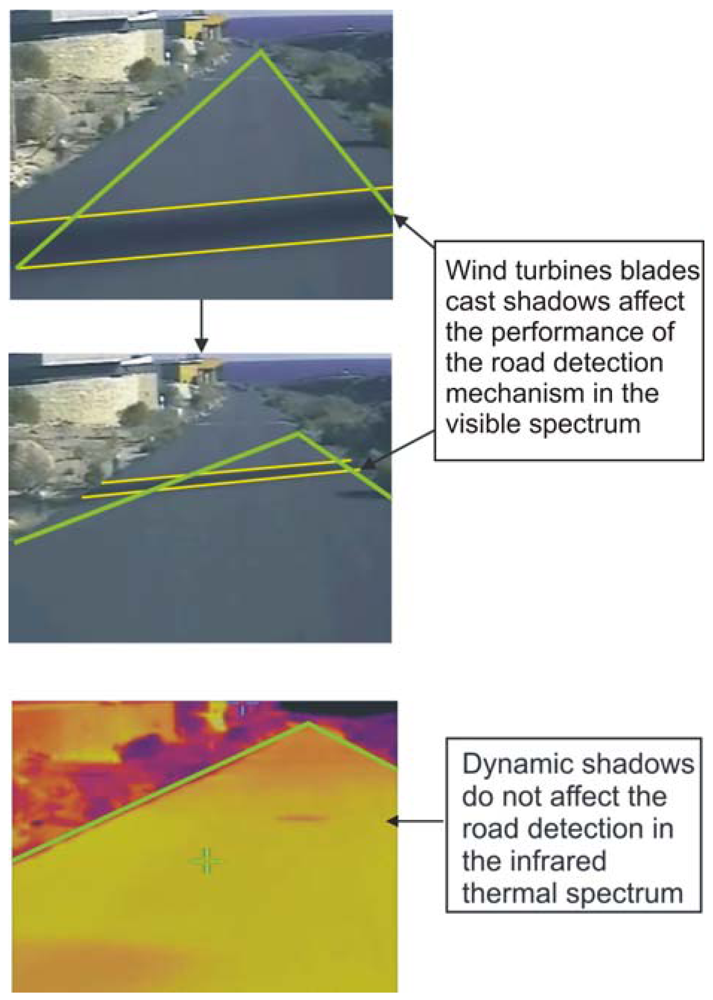 Cast shadows on the road cool the surface. If the shadow is static enough, the temperature of the shaded area starts to decrease, so a gradient of temperature between this area and a contiguous one that is irradiated by the sun appears. When this gradient surpasses certain value, the shadow is detected by both the visible and the thermal-based vision system as an obstacle. On the other hand, if the shadow is dynamic (as the ones cast by the wind turbines) there is less time for the asphalt to cool, so the gradient of temperature remains small.