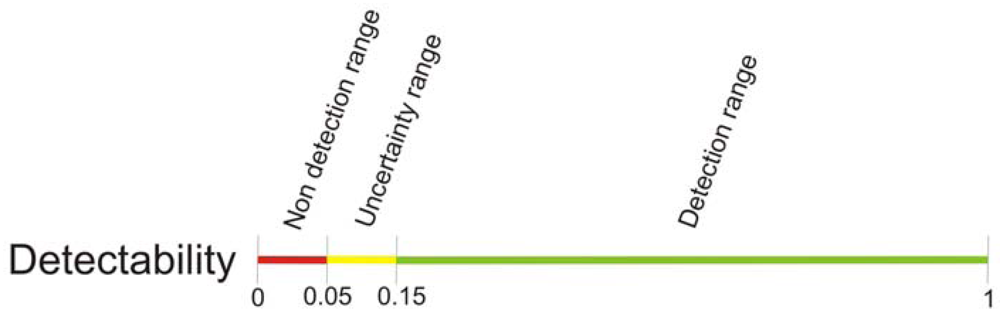 The detectability function on its own gives some idea of how well a gradient of temperature will be detected and segmented in the preprocessing step. However, it is necessary to establish some threshold above which it can be guaranteed the gradient will be detected.