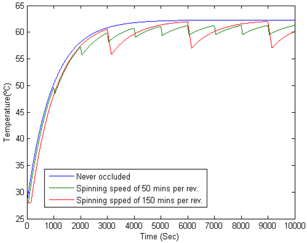 Temperature variation on a road patch surface due to periodic dynamic shadows. Green and red curves show temperature variations for a spinning speed of 50 and 150 minutes per revolution, respectively. Blue curve shows the temperature of a non-shaded road patch.