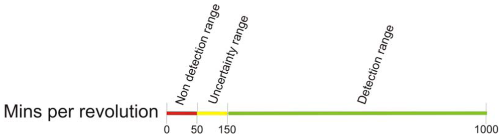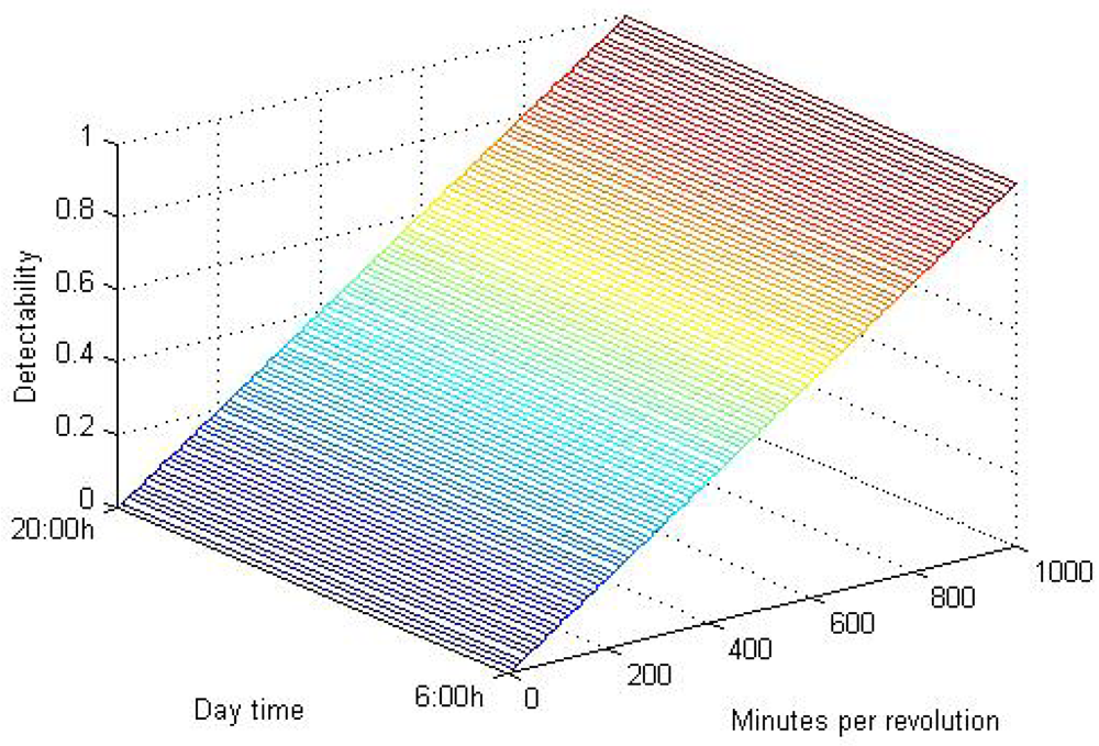 The relation between spinning speed and detectability is shown in Figure 14. As can be seen in ths figure, detectability grows inversely proportional to the spinning speed, while it remains independent of the time of the day. In windy conditions, wind turbines spins between 15 and 45 revolutions per minute, much faster that the lowest threshold obtained for the spinning speed, which is 50 m.p.r (50 minutes per revolution = 0.02 revolutions per minute). That is why in practice there is no noticeable gradient produced by the blades when the turbine is spinning. Only when it is almost stopped it can be detected.