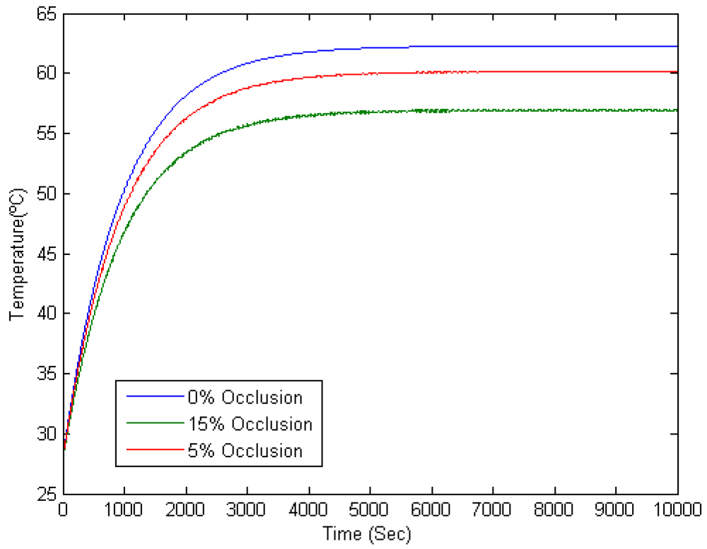 Temperature variation on a road patch surface due to periodic dynamic shadows for a spinning speed of 1 minute per revolution. Red and green curves show temperature variations for 5% and 15% of occlusion, respectively. Blue curve shows the reference temperature of a non-shaded road patch.