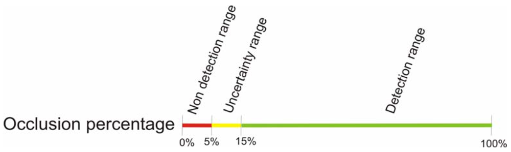 Thresholds for the occlusion percentage of the wind turbines. Non detection range (red): projection area gradient is not detected in the preprocessing step. Uncertainty range (yellow): it can not be guaranteed if the gradient is detected or not. It strongly depends on the perspective in which the scene is captured. Detection range (green): the gradient is strong enough for being detected in the preprocessing step.