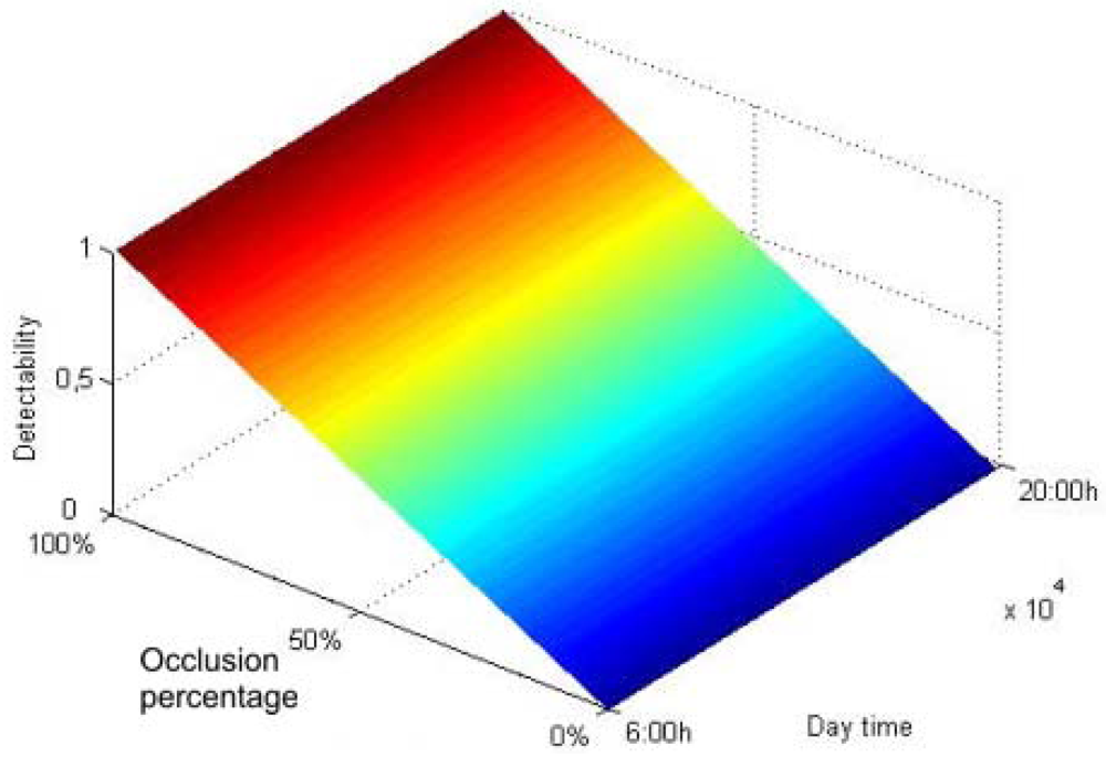 The thermal camera assigns a color to each temperature detected in a scene. The wider the range of temperature in the scene is, the smaller the difference in the color code assigned to small temperature gradients is. This means that it is more difficult to detect small gradients when the range of temperature in a scene is big, since they produce weak edges in the preprocessing step. With this in mind, a detectability function can be defined to determine how well the temperature gradient is going to be detected as an edge in the preprocessing step. Detectability is defined as
