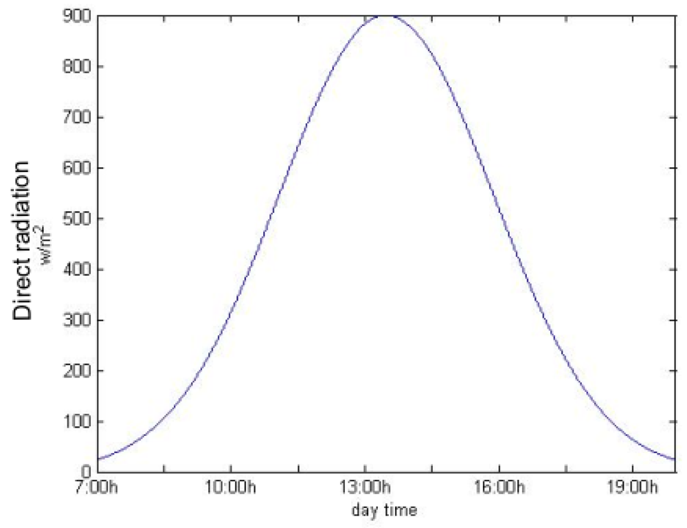 Asphalt temperature can be estimated using equation 3. Experimental results show that both the ambient temperature behavior and radiation intensity variations during a day can be approximated by a Gaussian distribution. In Figures 3 and 4 the direct radiation and the asphalt and ambient temperatures during a sunny day in the ITER surroundings, respectively, are shown.