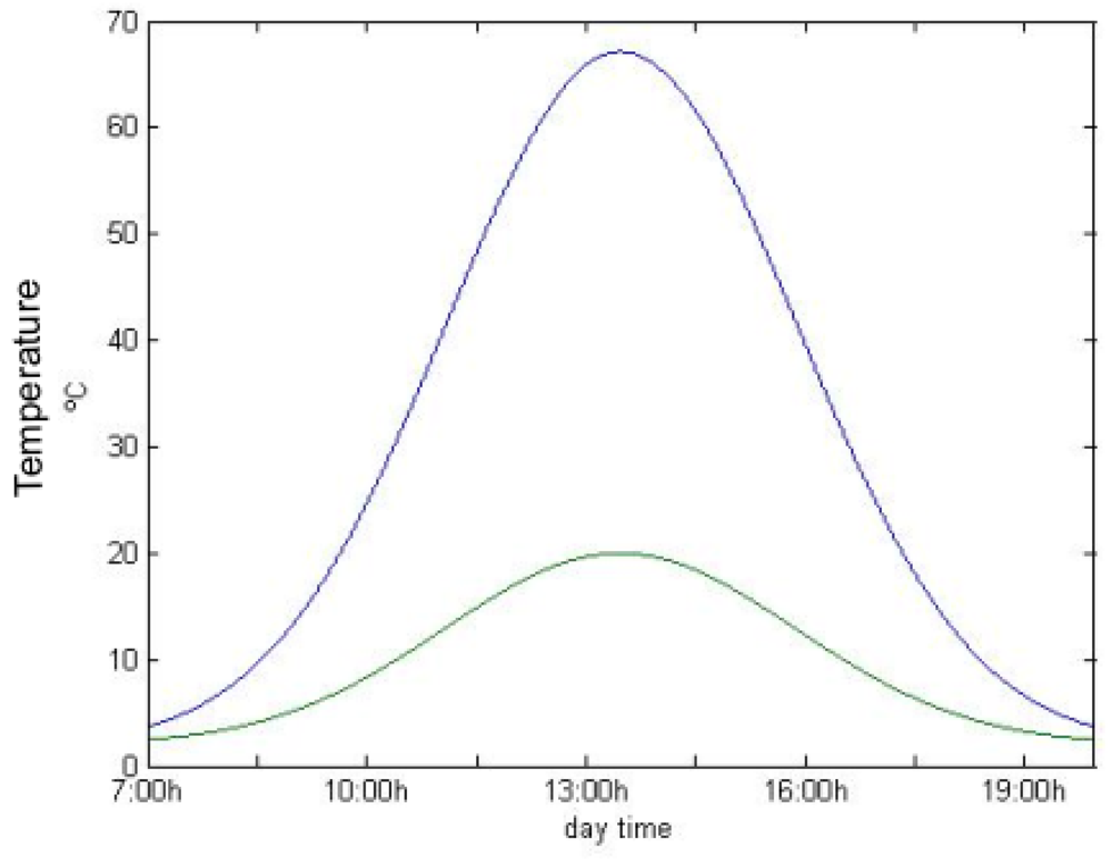 The temperature variation of a region of asphalt subject to a static shadow that blocks all the direct irradiation (100 % of occlusion) for a relatively long period of time is the one shown in Figure 6. In this figure, given an ambient temperature, it is shown how the temperature of the road surface (blue line) varies when it is exposed to periods of irradiation and shadows (green line).