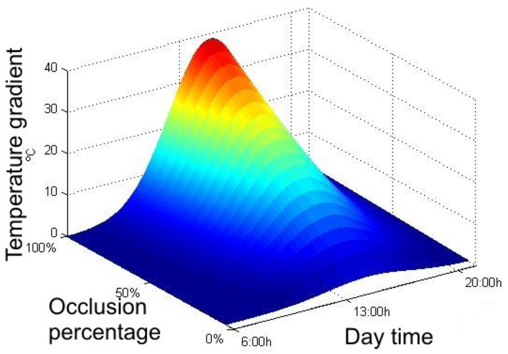 Temperature gradient between shaded and non shaded areas in proximity during a day for different occlusion percentages.