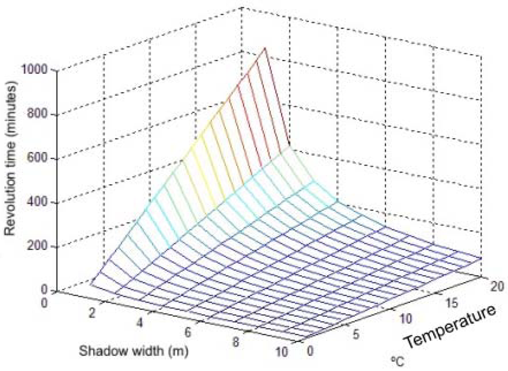 , so it is necessary the shadow covers this width in t seconds as maximum for the asphalt to cool 1°C. This gives a spinning speed shown in equation 6: