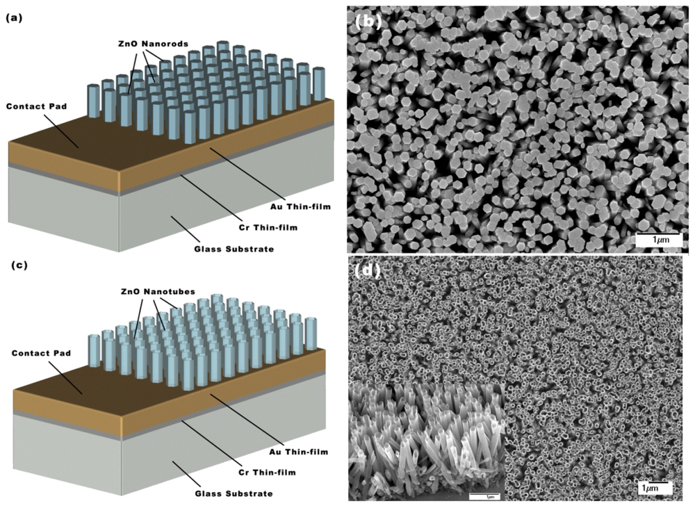 (a) and (c) schematic diagram of ZnO nanorod and nanotube pH sensors, respectively; (b) and (d) SEM images of ZnO nanorods and nanotubes, respectively (insert in image (d) shows tilted cross sectional view of nanotubes. The scale bar is 1 μm).