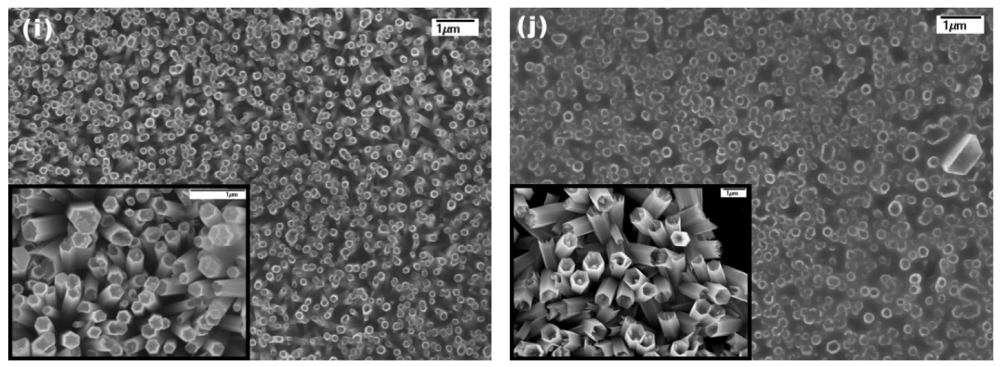 SEM images of the initial experimental results measuring ZnO nanorods/nanotubes after exposure to buffer solutions with (a) pH = 2, (b) pH = 4, (c) pH = 7, (d) pH = 8, and (e) pH = 12 for ZnO nanorods, and (f) pH = 2, (g) pH = 4, (h) pH = 7, (i) pH = 8, and (j) pH = 12 for ZnO nanotubes (the insert SEM images are the same ZnO nanotubes before exposure to corresponding pH values.)