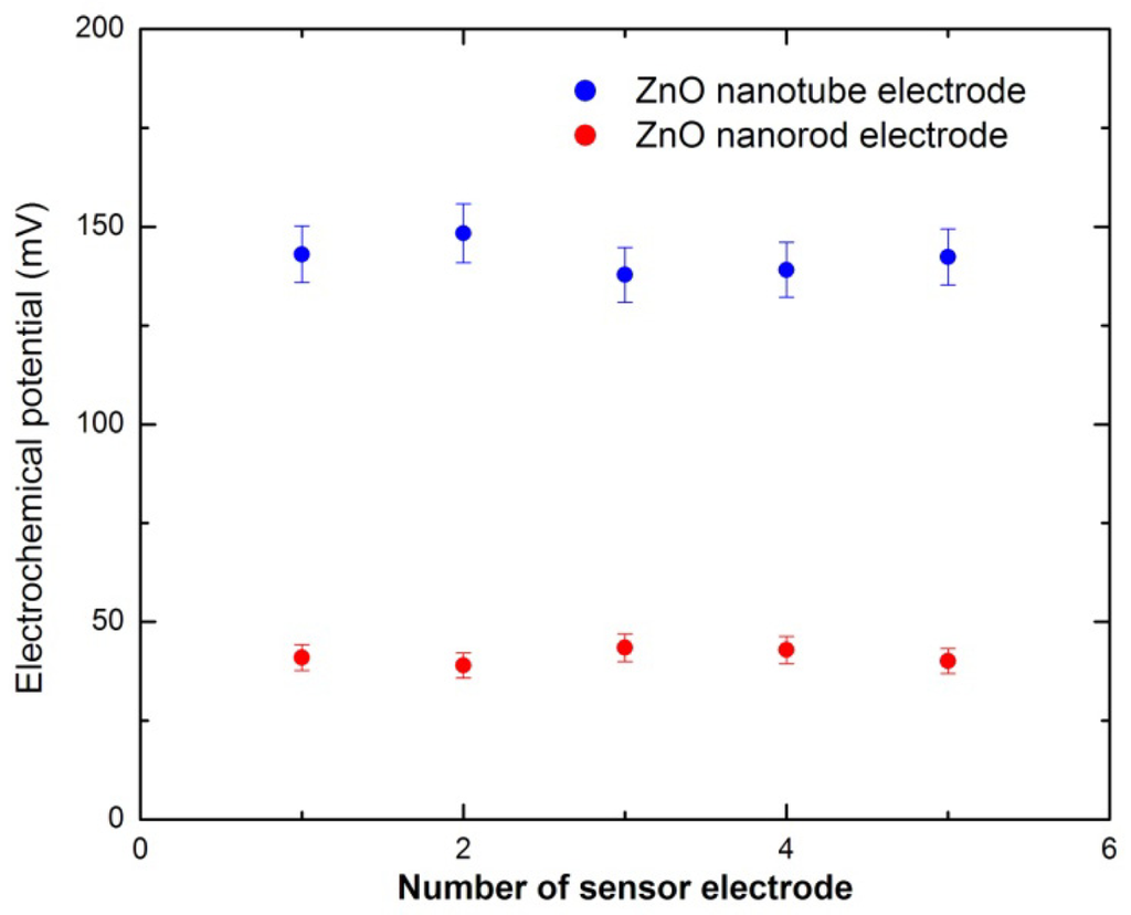 To obtain accurate and reusable pH sensors for application, parameters such as reproducibility, repeatability and stability were examined. Figure 3 shows the reproducibility test of the 10 independently developed ZnO nanotube and ZnO nanorod (5 ZnO nanotube electrodes and 5 ZnO nanorod electrodes) pH sensor electrodes in buffer solution at pH 6. The relative standard deviation determined from these measurements for both ZnO nanotube and nanorod pH sensor electrodes was less than 5%. Therefore, the procedure of detecting the pH of the solution is reliable.